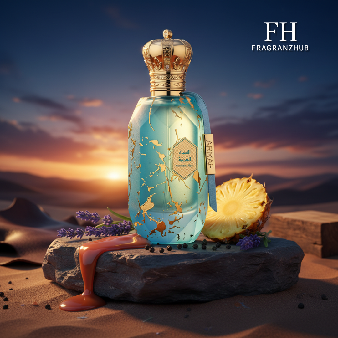 Arabian Sky de Armaf es una fragancia de la familia olfativa Amaderada Aromática para Hombres y Mujeres. Esta fragrancia es nueva. Arabian Sky se lanzó en 2024. Las Notas de Salida son bergamota, toronja (pomelo), aceite de naranja, limón (lima ácida), piña y pimienta; las Notas de Corazón son geranio, ylang-ylang, lavanda y caramelo; las Notas de Fondo son almizcle, cedro, vetiver, ámbar, pachulí y cuero.