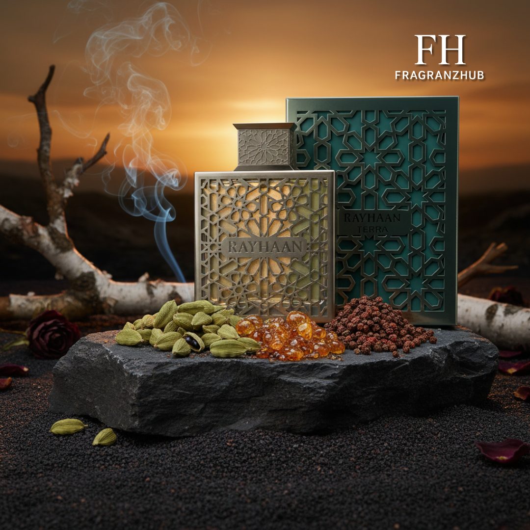 Terra de Rayhaan es una fragancia de la familia olfativa Oriental Especiada para Hombres. Esta fragrancia es nueva. Terra se lanzó en 2025. Las Notas de Salida son cardamomo, elemí, bergamota, limón (lima ácida) y pimienta de Sichuan; las Notas de Corazón son pachulí, comino, cilantro, anís, azafrán, flor de azahar del naranjo, ajenjo (absenta), geranio y rosa; las Notas de Fondo son Incienso, vainilla, ámbar, benjuí, opopónaco, madera de oud, ládano, abedul, almizcle, ámbar gris y Maltol.